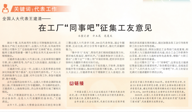 当选全国人大代表以来,王建清始终立足东风产业工人岗位,将履职之根深深扎在基层。他把东风车间当作履职阵地,把工友心声当作履职方向,东风商用车有限公司整车工厂的“同事吧”成为他征集意见建议的重要平台。在这里,他收集一线工友的所思所想、所盼所求,短短几天的意见征集帖便能达到90%以上的工厂阅读率,超两千人次参与回帖,数项高质量建议均源于此,工友们“条条都是好建议,造福基层员工”的留言,是对他履职工作最真切的认可。